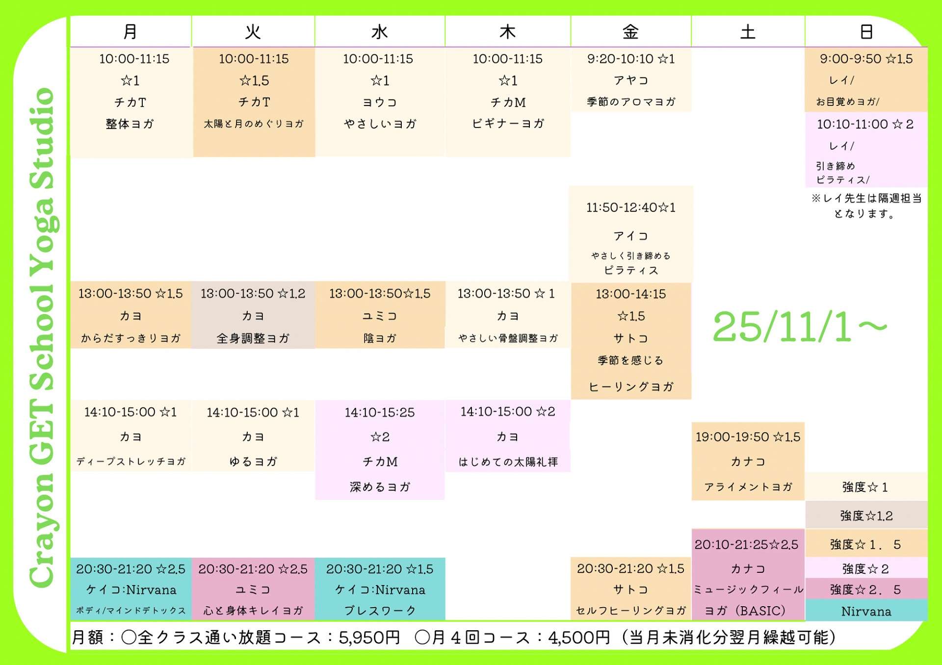 クレヨンヨガスタジオは月曜日から日曜日まで